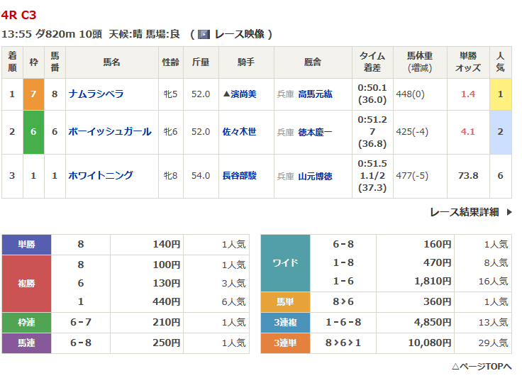 軸としていた6番は道中オジャマ要素である雷にも打たれることなく(そんな気象条件でレース開催するなよ)、一応最後に伸びてきたものの時すでに遅しで4着という結果に。
